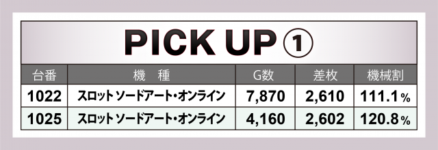 『からくりサーカス』に続き同じくスマスロの『スロット ソードアート・オンライン』は設置3台中2台が+2千6百枚超となり、30パイマシンの『ハナハナホウオウ~天翔~-30』も好調を導いたが、もう少し稼働が伸びて欲しいところだった。
