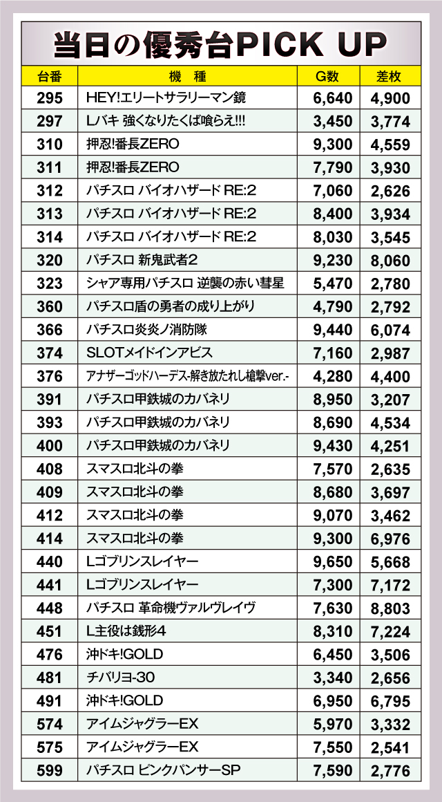 まずは優秀台PICK UPを確認。取り上げた30台すべてが差枚+2,500枚overと十分満足できる結果となった。特に『パチスロ 新鬼武者2』や『パチスロ 革命機ヴァルヴレイヴ』では+8,000枚over。続いて『Lゴブリンスレイヤー』や『L主役は銭形4』は+7,000枚overと、その実力を存分に発揮していた。