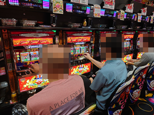 夕方頃のパチスロでは、『ゴーゴージャグラー3』に笑顔のプレイヤーが並んでいた。