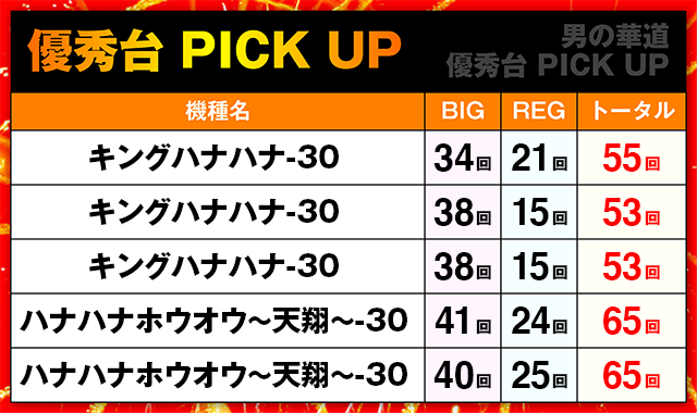 「キングハナハナ-30」にも、トータルで50回を超えた台が複数あった。