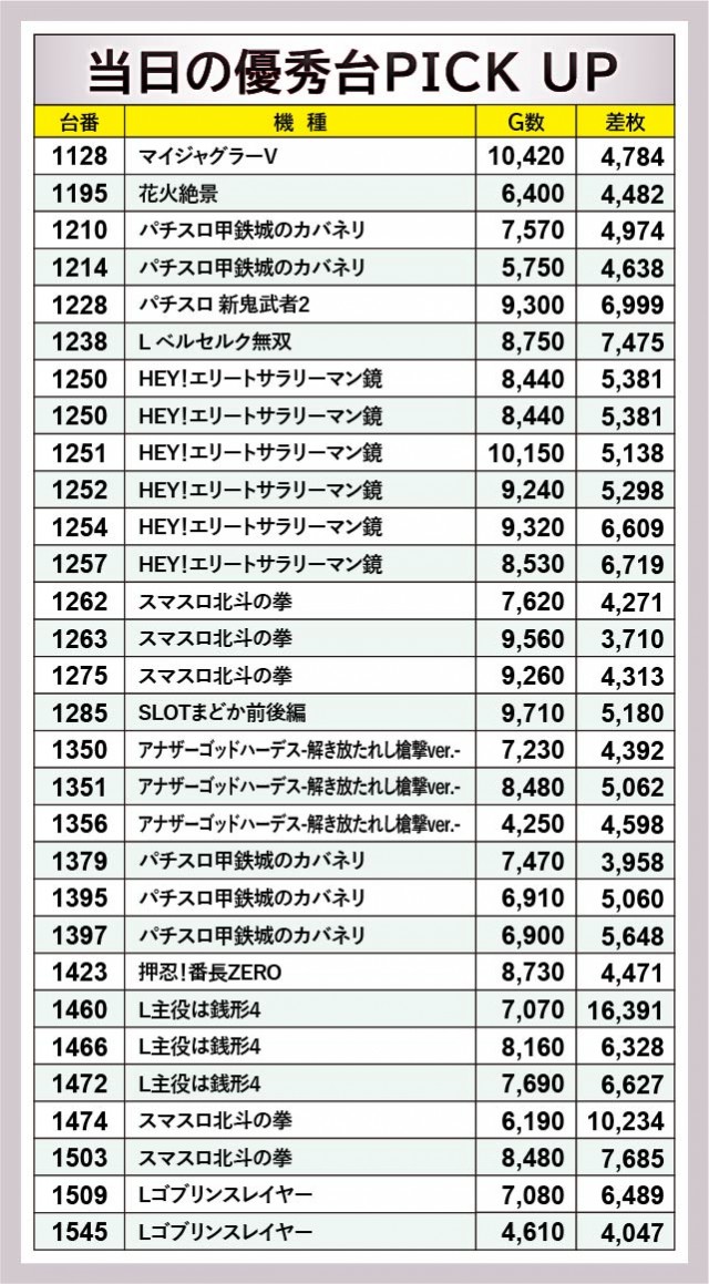 『L主役は銭形4』1460番台+16,391枚・『スマスロ北斗の拳』1474番台+10,234枚と、スマスロ2台から万枚OVERが発生。ほかにも5千枚OVERが多く発生しており、店内は凄まじい熱気に包まれていたと言える。また『マイジャグラーⅤ』1128番台10,420G・『HEY!エリートサラリーマン鏡』1251番台10,150Gなど万回転OVERも確認でき、遊技していたファンは確かな手応えを感じながら、遊技を楽しんでいたことだろう。