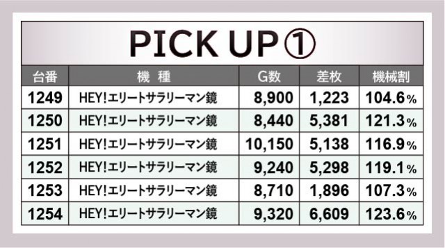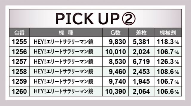 『HEY!エリートサラリーマン鏡』全12台は、いずれも朝からじっくりと打ち込まれた様子だ。1254番台+6,609枚・1257番台+6,719枚という2台の6千枚OVER、そして4台の5千枚OVERが生まれていることから、活気だけでなく熱気にも包まれていた。何よりも12台全てがプラス域で終えているため、当日は満足度の高いエリアだったと断言できる。