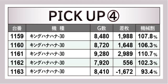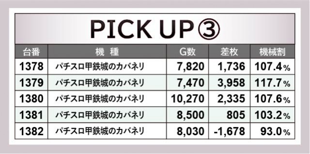 人気機種『パチスロ甲鉄城のカバネリ』もまた活気と熱気に包まれた機種の1つである。1378~1382番台の全5台がプラスとはならなかったが、1379番台+3,958枚と十分な熱量を放っていた。『キングハナハナ-30』も同様で、朝からじっくりと打ち込まれた形跡を確認でき、コンスタントなボーナス当選によって笑顔の華が咲き乱れていたことだろう。