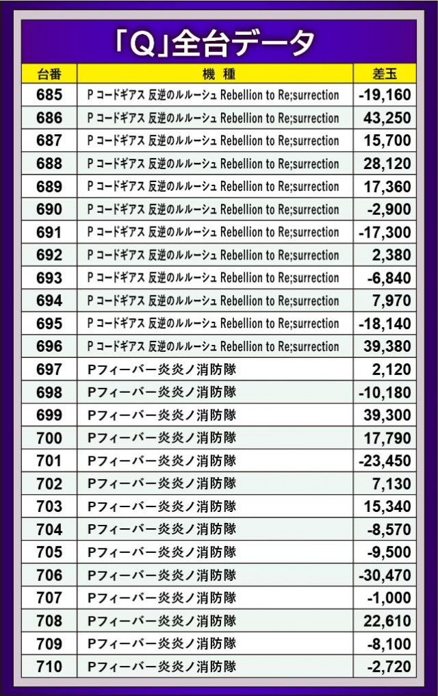 『P コードギアス 反逆のルルーシュ Rebellion to Re;surrection』686番台+43,250玉・696番台+39,380玉と、同機種からの凄まじい熱量が印象的だ。ほかにも万発OVERが多く見られ、ファンも有意義な時間を過ごせたことだろう。また『Pフィーバー炎炎ノ消防隊』699番台+39,300玉という数字も確認でき、島は熱気に包まれていた。