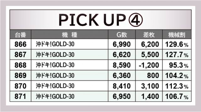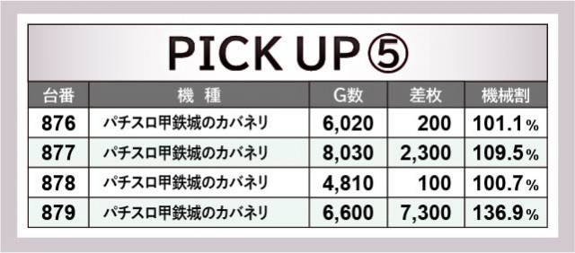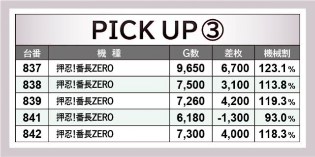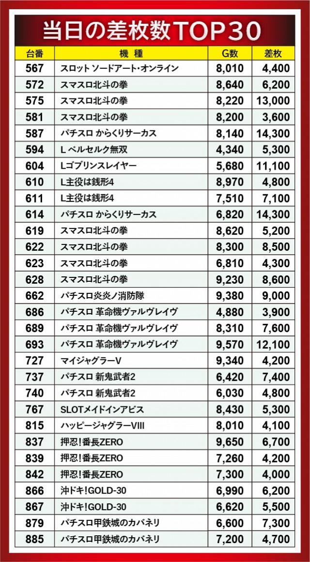 『押忍!番長ZERO』837番台+6,700枚や『沖ドキ!GOLD-30』866番台+6,200枚、『パチスロ甲鉄城のカバネリ』879番台+7,300枚など、各機種で大台を突破する台が見られた。ゲーム数から手応えのほどを窺うことができ、自信を持ってレバーを叩けていたのではないだろうか。右肩上がりに伸びる出玉に比例して、ファンの満足度も高かったに違いない。