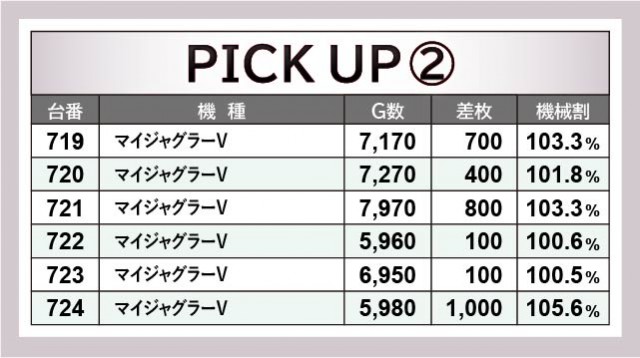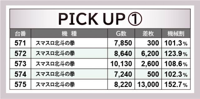 『スマスロ北斗の拳』575番台+13,000枚というセンセーショナルな記録が生まれ、573番台についても万回転OVERを達成している。5台並びは全台プラス差枚を築いていることから、熱気に包まれたエリアとなった。また『マイジャグラーⅤ』に関しても、719~724番台の6台横並びが全台プラス差枚で終えている。コンスタントなボーナス当選によって、レバーを叩く力もまた強くなっていったはずだ。