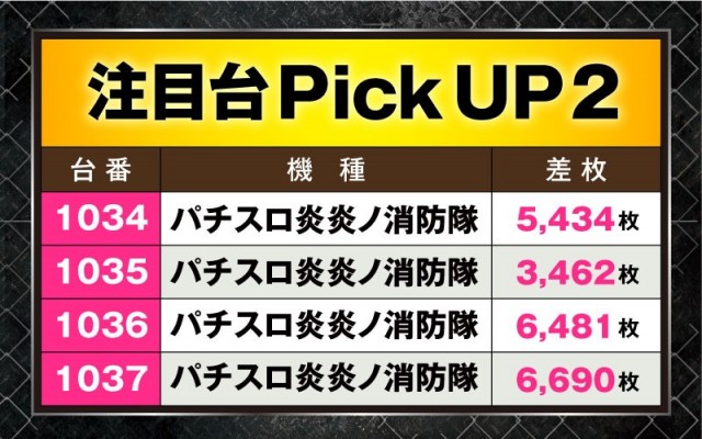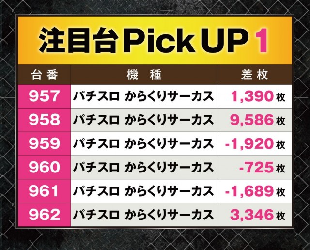店内状況でまず目についたのが『パチスロ からくりサーカス』。なかには9,586枚という万枚一歩手前の活躍を見せていた。『パチスロ炎炎ノ消防隊』は全台プラスなうえ、平均5,517枚と記録的な数値を叩き出している。