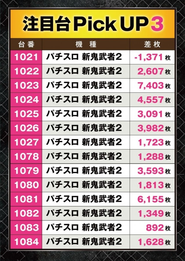 『パチスロ 新鬼武者2』は14台全てが対象となっており、内13台がプラスの平均2,765枚という素晴らしい結果を残した。