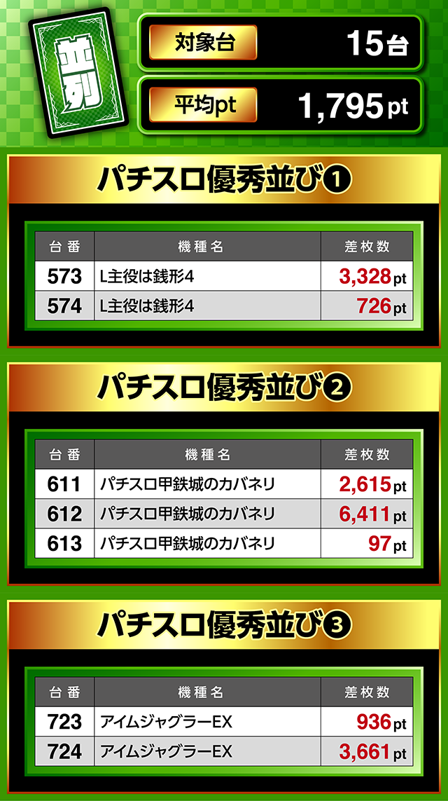 611番台から613番台までの「パチスロ甲鉄城のカバネリ」が並んでプラスとなり、612番台は6,400ptオーバー。
