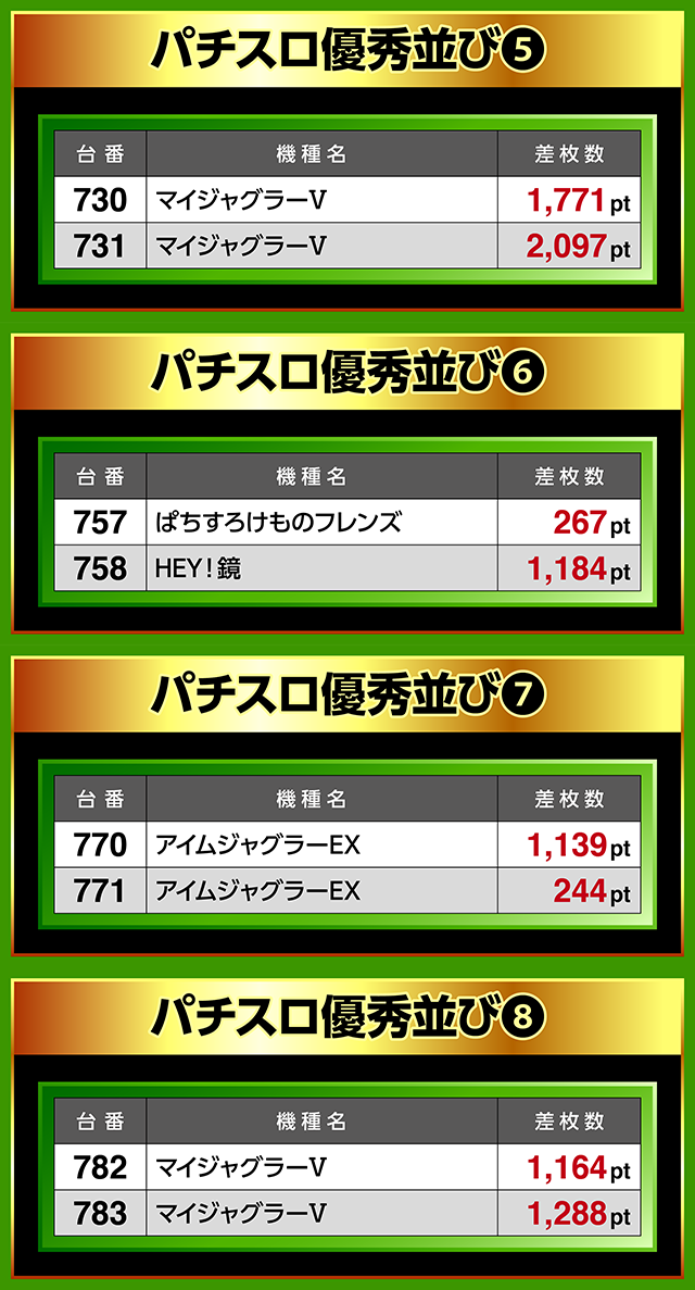 「マイジャグラーⅤ」にも、730番台と731番台、782番台と783番台に1,100pt以上が並んだ。