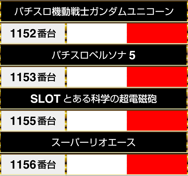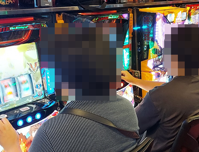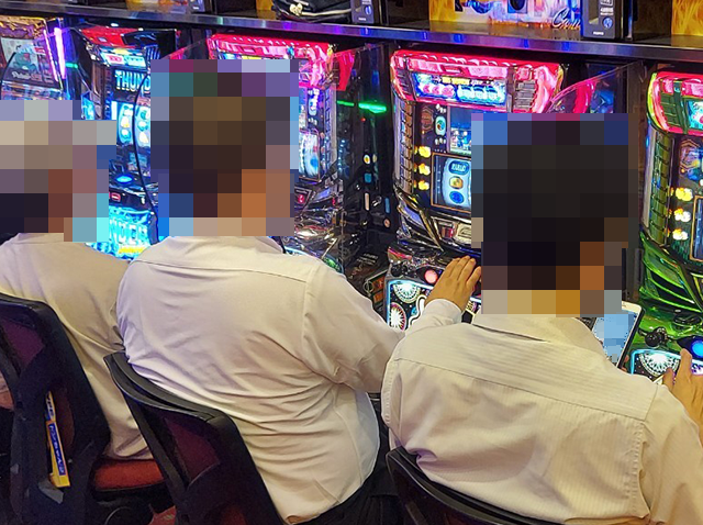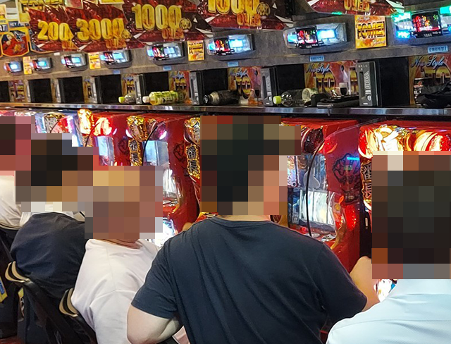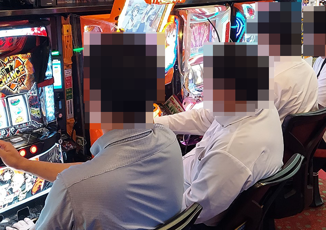 夕方頃のパチスロでは、1152番台の『パチスロ機動戦士ガンダムユニコーン』から1156番台の『スーパーリオエース』までに笑顔のプレイヤーが並んでいた。