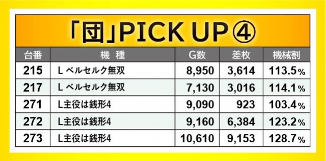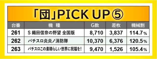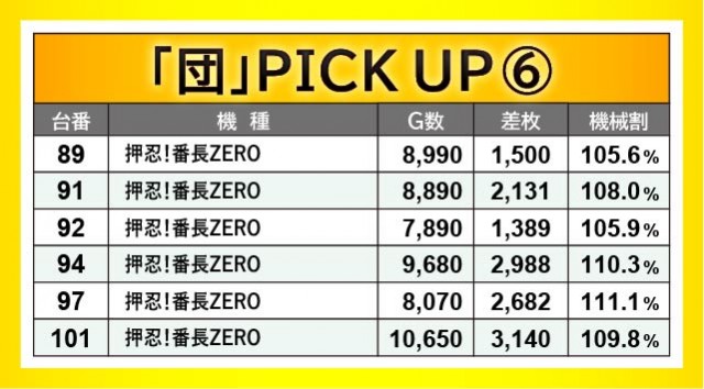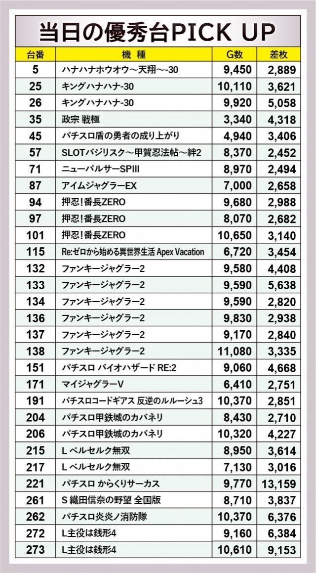 前述した『L主役は銭形4』273番台+9,153枚という記録が目立つが、そのほかの機種に関しても、『パチスロ炎炎ノ消防隊』262番台+6,376枚などの大台を突破した台を確認できる。もちろん回転数は朝から終日を通して打ち込まれていた様子で、やはりファンはしっかりと可能性を感じていたのだろう。261~263番台のバラエティーコーナー、そして『押忍!番長ZERO』という人気を博した名機も活躍し、AT機群はそれぞれの役目をしっかりと果たしたと言える。