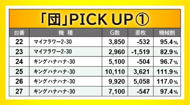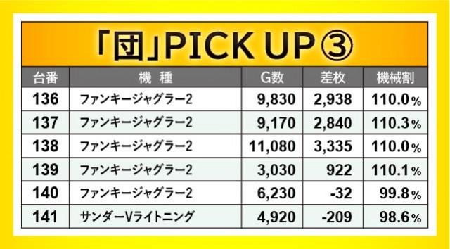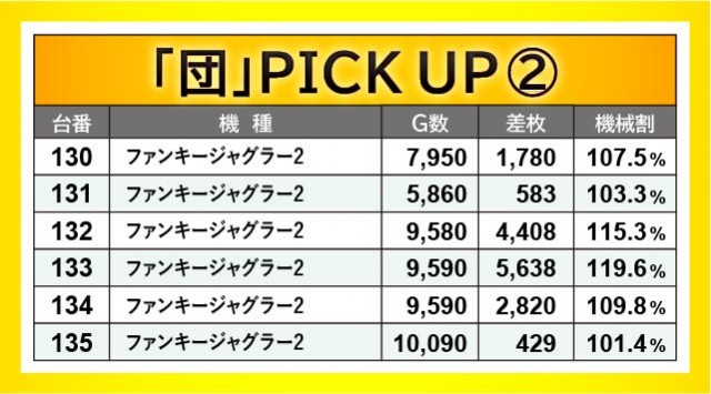 『キングハナハナ-30』26番台+5,058枚や『ファンキージャグラー2』133番台+5,638枚など、ボーナスのみで出玉を増やしていくゲーム性ながら、大きな出玉を積み上げていたのが印象的だ。特に後者は多くのゲーム数が消化されているため、いかに遊技していたファンが好感触を得ていたのかが窺える。残念ながらマイナス差枚に沈んだ台があるものの、コンスタントなボーナス当選が発生したことにより、痛手にならずに済んだ様子も見逃せない。