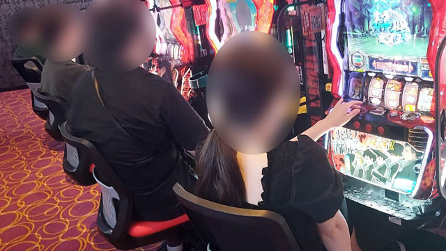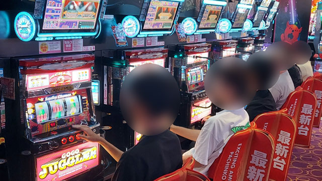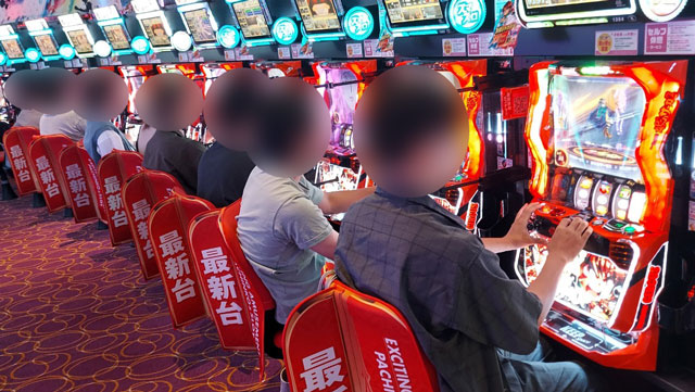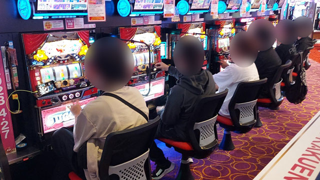 取材当日のホール内でまず紹介したいのは、「スマスロ北斗の拳」や「スロット ソードアート・オンライン」といったスマスロの人気機種たち。それらの周囲は多くのファンたちで活気に溢れており、シマのアチコチで存分に楽しむ光景を目撃。また「マイジャグラーⅤ」を含むジャグラーシリーズも朝イチから盛況で、普段からチカラを入れていることが窺えた!
