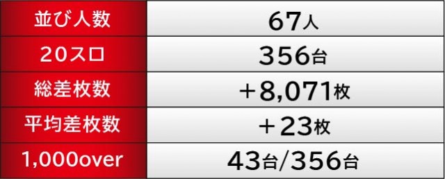 改めて結果をお伝えすると、総差枚数+8,071枚という数字で勝利を収めた。店内にはしっかりとポテンシャルが秘められた台が存在しており、ファン諸氏はしっかりと可能性を見抜いていた様子が窺える。これからも足繫く通うファンに対し、同店はあらゆる場所に仕掛けを施してくるだろう。そのため、ファン諸氏は情報や動向をしっかりとチェックしてもらい、入念な準備を進めておくことを推奨するぞ!