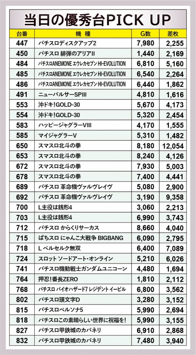 全国的な人気を誇る『スマスロ北斗の拳』にて万枚OVERが発生。650番台+12,054枚を筆頭に、ほかにも672番台+5,003枚など大台突破台が見られた。また『パチスロ 革命機ヴァルヴレイヴ』692番台+9,358枚や『L ベルセルク無双』718番台+7,089枚など、スマスロらしい熱気を放っていたのも見逃せない。もちろんスマスロ以外にも盛り上がっていた機種は多く見られたため、次の項からはより詳細な部分を紹介していこう!