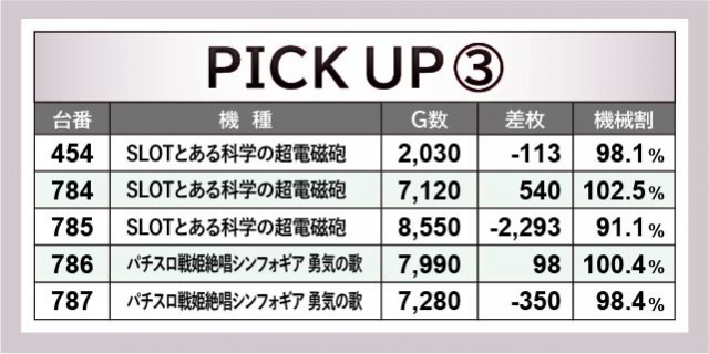 まず『アナザーゴッドハーデス-解き放たれし槍撃ver.-』について、各所でじっくりと打ち込まれた結果、2台の3千枚OVERが生まれた。それ以上に注目が集まったのは『パチスロANEMONE 交響詩篇エウレカセブン HIーEVOLUTION』で、こちらは全台系となった結果、484番台+5,160枚という大きな記録を達成。さらに『SLOTとある科学の超電磁砲』『パチスロ戦姫絶唱シンフォギア 勇気の歌』も対象となっていたが、こちらは残念ながら展開に恵まれなかった様子だ。しかしファンはしっかりとポテンシャルを見抜き、終日を通して打ち込んでいた様子が回転数から窺えるため、粘り強く戦い抜いたことを称賛したい。