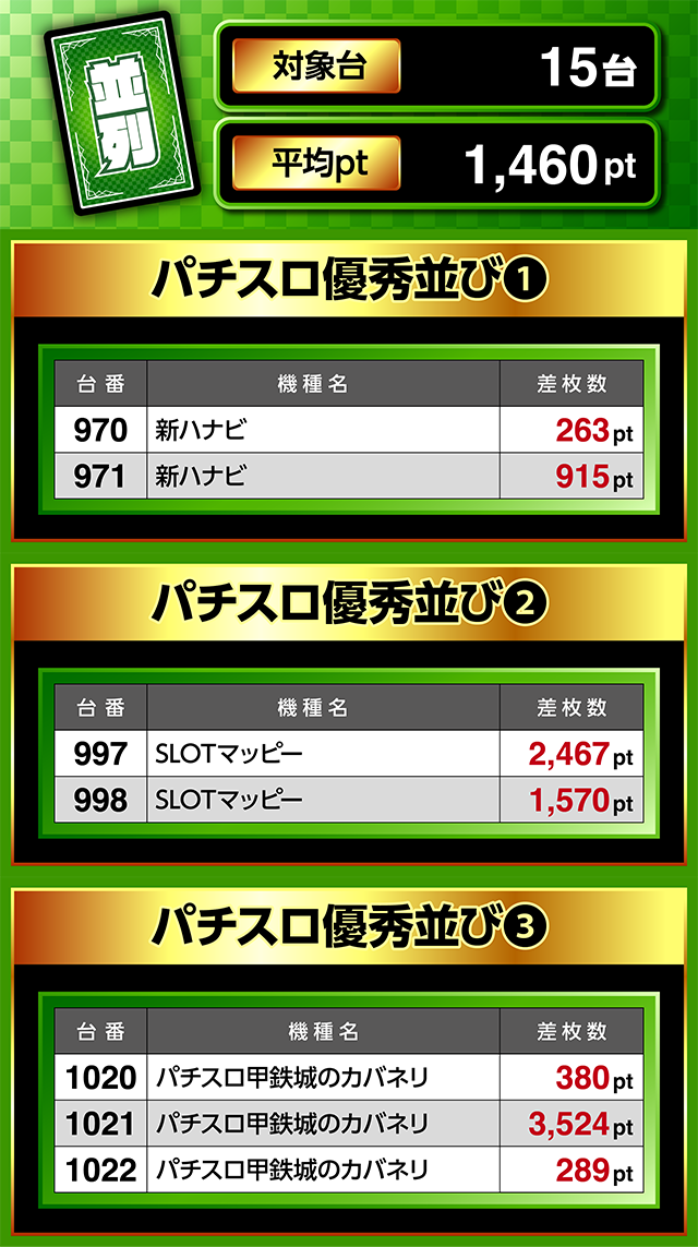 997番台と998番台の「SLOTマッピー」は、2,467ptと1,570pt。