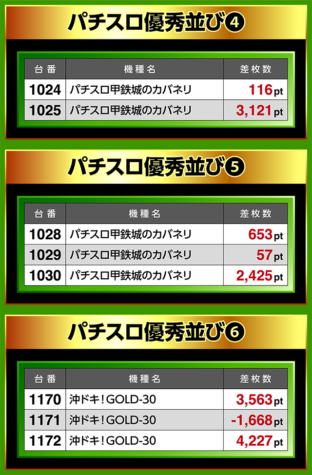 「沖ドキ!GOLD-30」の並びでは、3,563ptや4,227ptを記録する台があった。