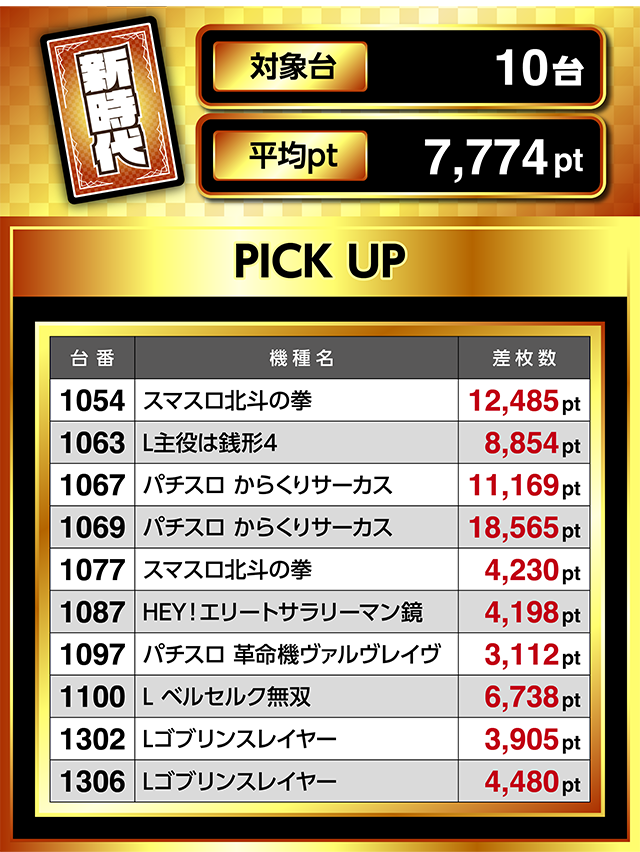 1054番台の「スマスロ北斗の拳」も12,000ptを上回った。