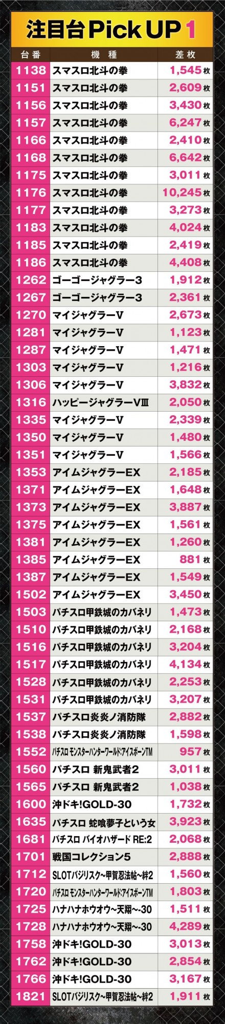 今回特に目を引いたのが『スマスロ北斗の拳』、ジャグラーシリーズ、『パチスロ甲鉄城のカバネリ』だ。対象台数が多いだけでなく、台番号を見ての通り至る所に好調台が散りばめられている。各平均は『スマスロ北斗の拳』が4,189枚、ジャグラーシリーズは2,023枚、『パチスロ甲鉄城のカバネリ』は2,740枚と、見事な内容となっていた!