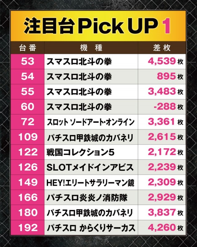 そのほか『パチスロ からくりサーカス』で4,260枚、『パチスロ甲鉄城のカバネリ』で3,837枚と続き、『スマスロ北斗の拳』以外の機種は全て2,000枚オーバーと優秀な結果を残していた!