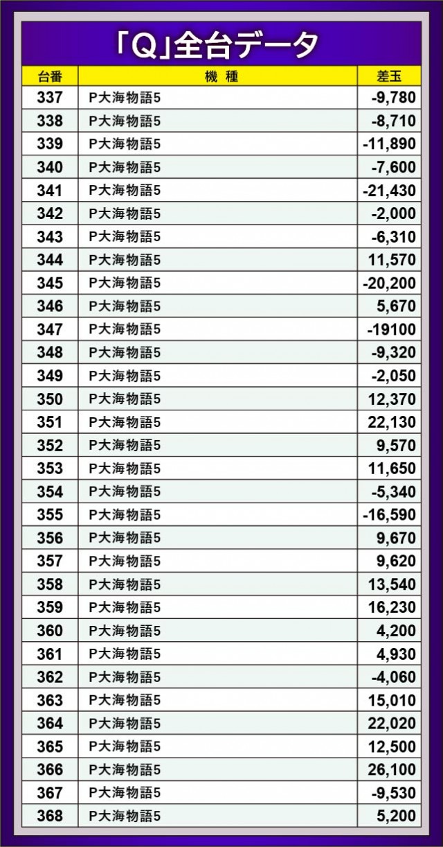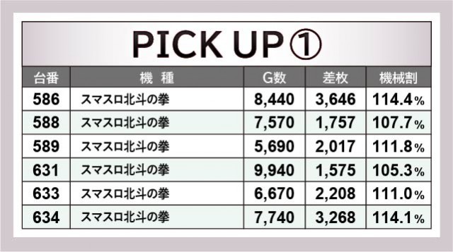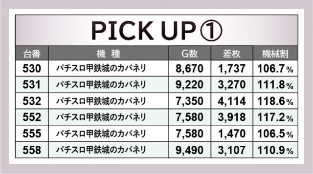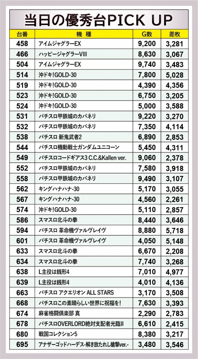 『パチスロ甲鉄城のカバネリ』は各台がじっくりと打ち込まれていた。その結果、532番台+4,114枚をはじめとした3千枚OVERが発生しており、ファンは有意義な時間を過ごしたと言える。また『スマスロ北斗の拳』も同様で、回転数と差枚数が比例した展開が多く見られた。両機種ともパチスロ業界を牽引する存在であるため、今後とも動向から目が離せない。