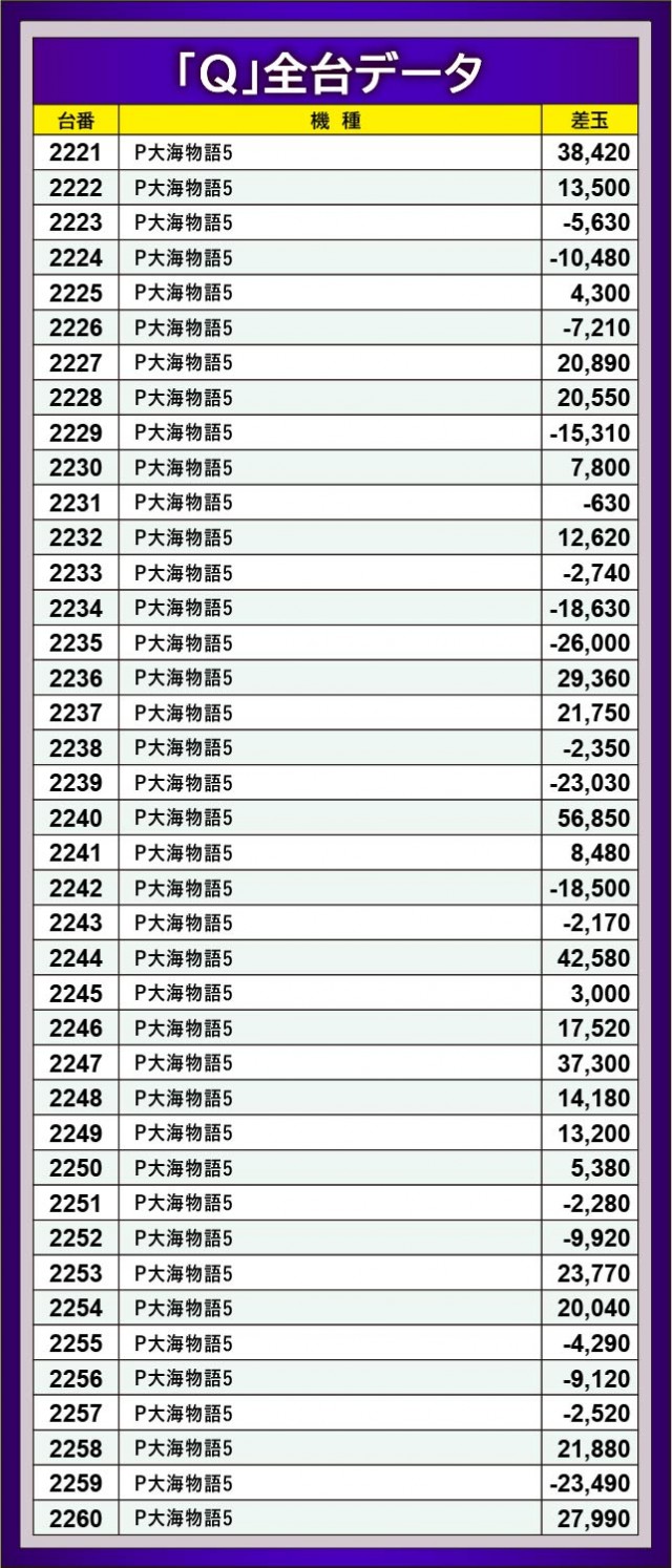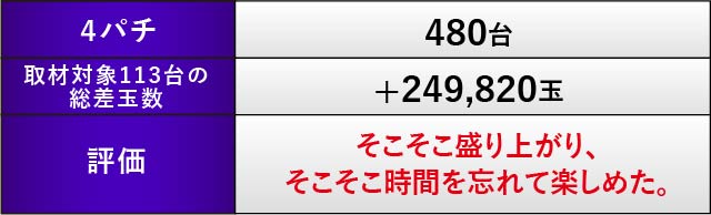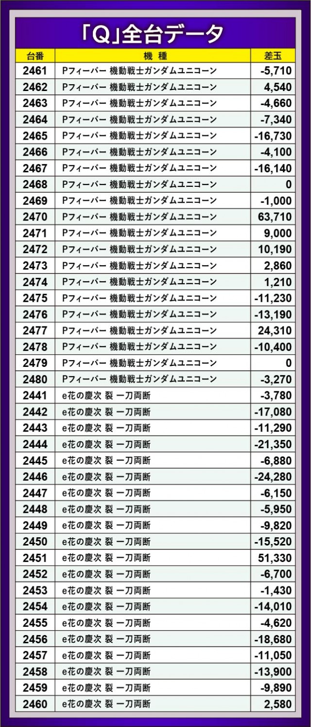 当然のように万発OVERが発生しているが、その中でも秀でた数字を残した機種がある。『P大海物語5』2240番台+56,850玉、『Pフィーバー 機動戦士ガンダムユニコーン』2470番台+63,710玉、『e花の慶次 裂 一刀両断』2451番台+51,330玉が該当し、多くのファンから羨望の眼差しを集めていた。
