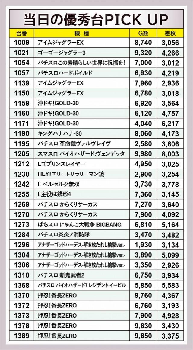 『スマスロ バイオハザード:ヴェンデッタ』1205番台+8,003枚と、導入されたばかりの新台がさっそく大きな活躍を披露してくれた。ほかにも『沖ドキ!GOLD-30』1171番台+6,217枚など、4~5千枚OVERが多発していたのも好印象を覚えるばかりだ。また『押忍!番長ZERO』が5台も名を連ねており、導入されてからしばらく経つが、まだまだ現役であることを知らせる数字を残しているのも驚きを隠せない部分だ。