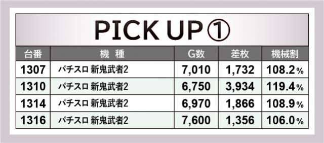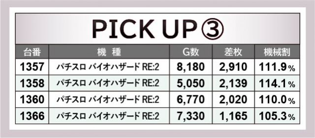 6.5号機群の活躍に着目すると、『パチスロ 新鬼武者2』1310番台+3,934枚や『パチスロ甲鉄城のカバネリ』1320番台+2,464枚、『パチスロ バイオハザード RE:2』1357番台+2,910枚などの結果が見られた。人気を集める機種たちの活躍は、多くのファンにとって安心する要素ではないだろうか。いずれもじっくりと打ち込まれているのが特徴的で、これからも同店の盛り上がりを支える存在となってくれるのはたしかだ。