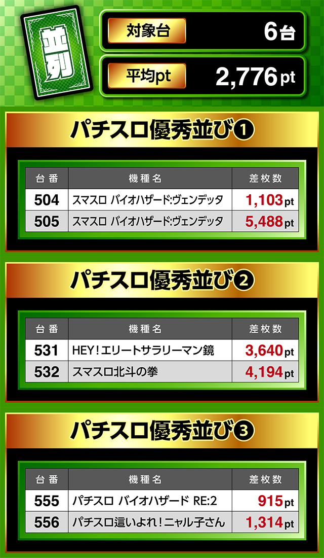 最新機種以外では、531番台の「HEY!エリートサラリーマン鏡」と532番台の「スマスロ北斗の拳」が並んで3,600ptオーバー。