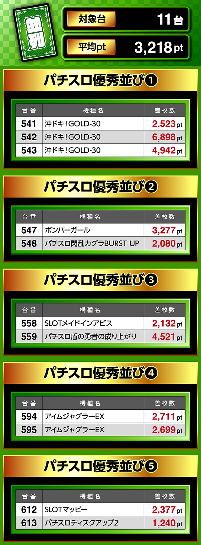 541番台から543番台までの「沖ドキ!GOLD-30」が並んで2,500ptを超え、542番台は6,800ptオーバー。