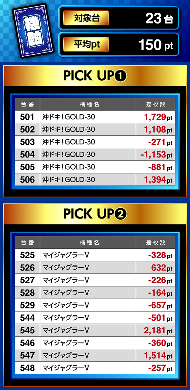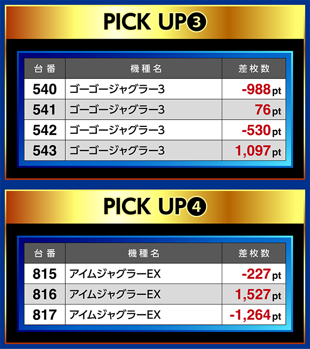 1,000pt以上の台は、「アイムジャグラーEX」や新台の「ゴーゴージャグラー3」にもあった。