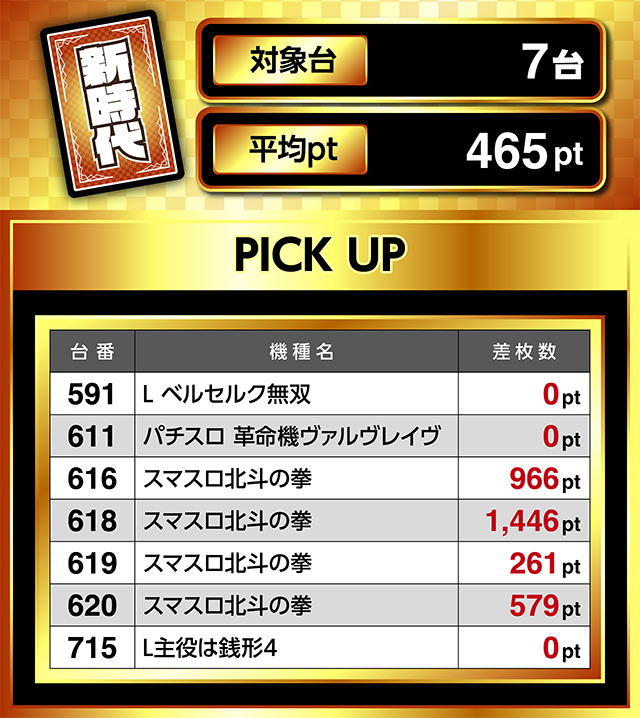 「スマスロ北斗の拳」はピックアップした4台がすべてプラスとなり、618番台は1,446ptを記録。
