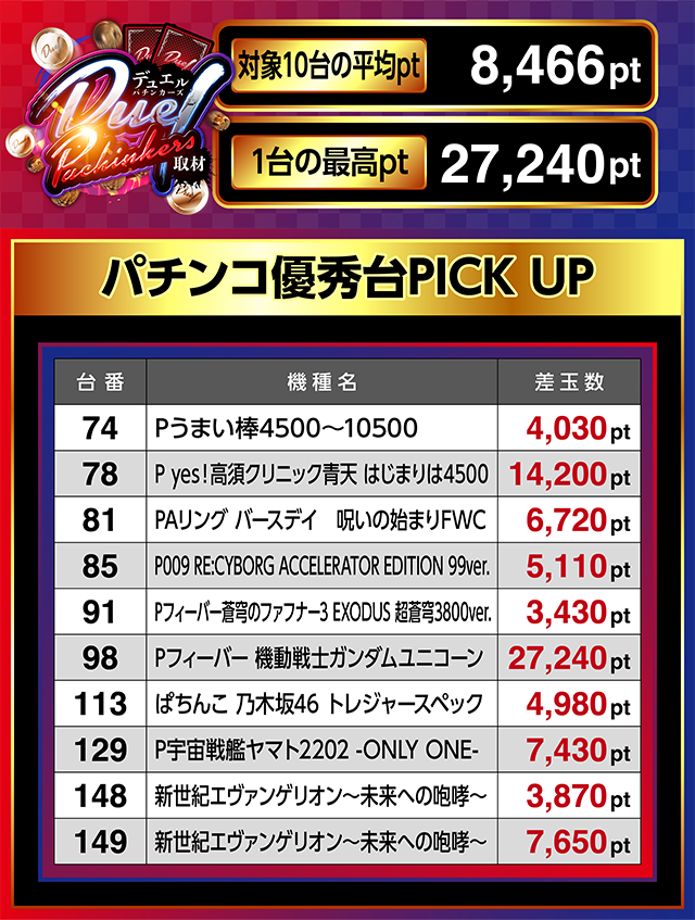 129番台の「P宇宙戦艦ヤマト2202 -ONLY ONE-」や149番台の「新世紀エヴァンゲリオン~未来への咆哮~」なども7,000ptを上回った。