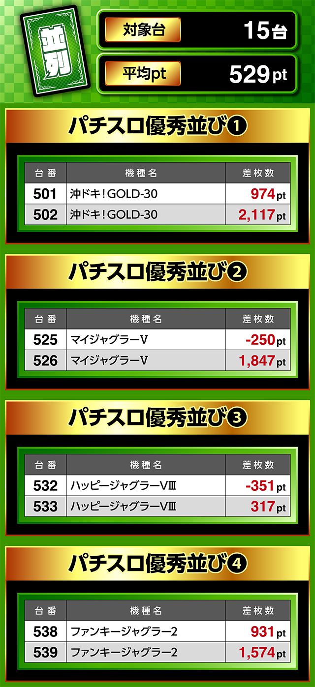 539番台の「ファンキージャグラー2」は1,500ptを上回った。
