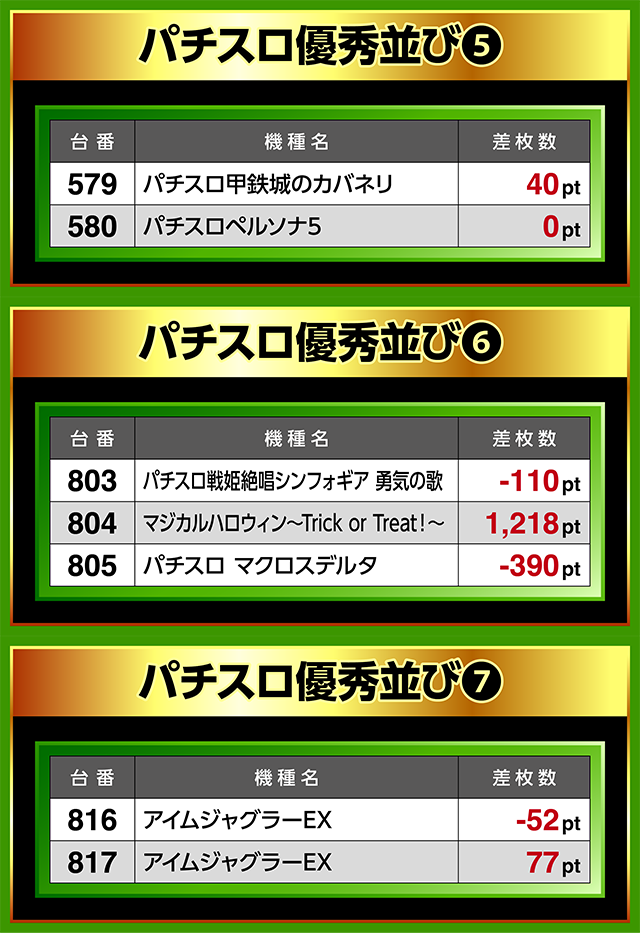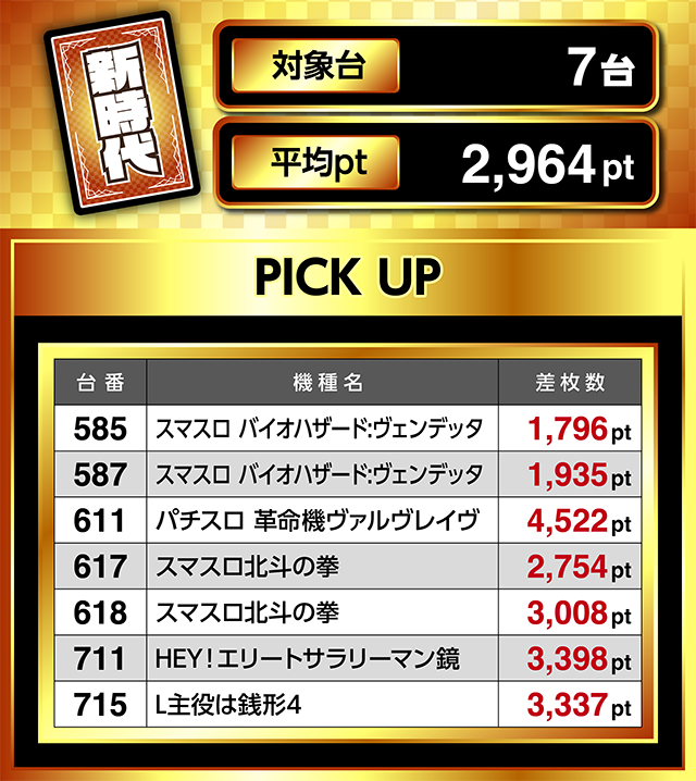 最新機種も盛況で、「スマスロ バイオハザード:ヴェンデッタ」の585番台と587番台が1,700ptを上回った。