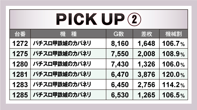 続いては特に賑わいを見せていた3機種を紹介。まず「スマスロ北斗の拳」は、861番台の+7,631枚を筆頭に+2,000以上の記録をマーク。続いて「パチスロ甲鉄城のカバネリ」は、ピックアップした6台のうち3台が+2,000枚以上の好調ぶり。そして「沖ドキ!GOLD-30」は、ピックアップした12台全てが出玉率110%以上を叩き出しており、12台の平均差枚はなんと+3,730枚と圧倒的! この日もっとも活躍していた機種で間違いないだろう! 総じてハイスペック機種に注力していた印象だ。