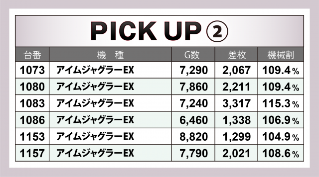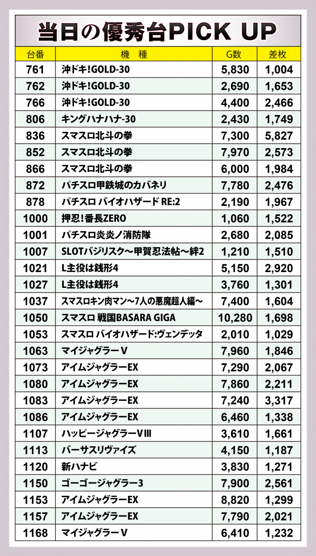 まずは優秀30台のPICK UPから。定例では上位30台を挙げるのだが、今回は1台そちらに及ばなかったのが残念。29台のうち全体の3分の1弱となる11台が差枚数+2千枚以上を達成、+3千枚以上は2台、+5千枚オーバーは1台となった。