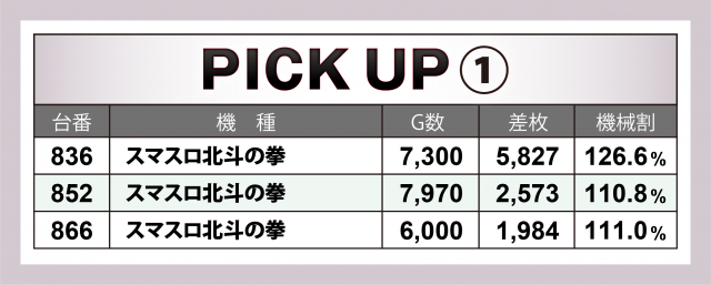 続いては好調2機種計9台をチェック。どちらの機種も前回と同じPICK UP対象となり、9台全てが4桁のプラスを成し遂げた。