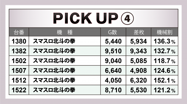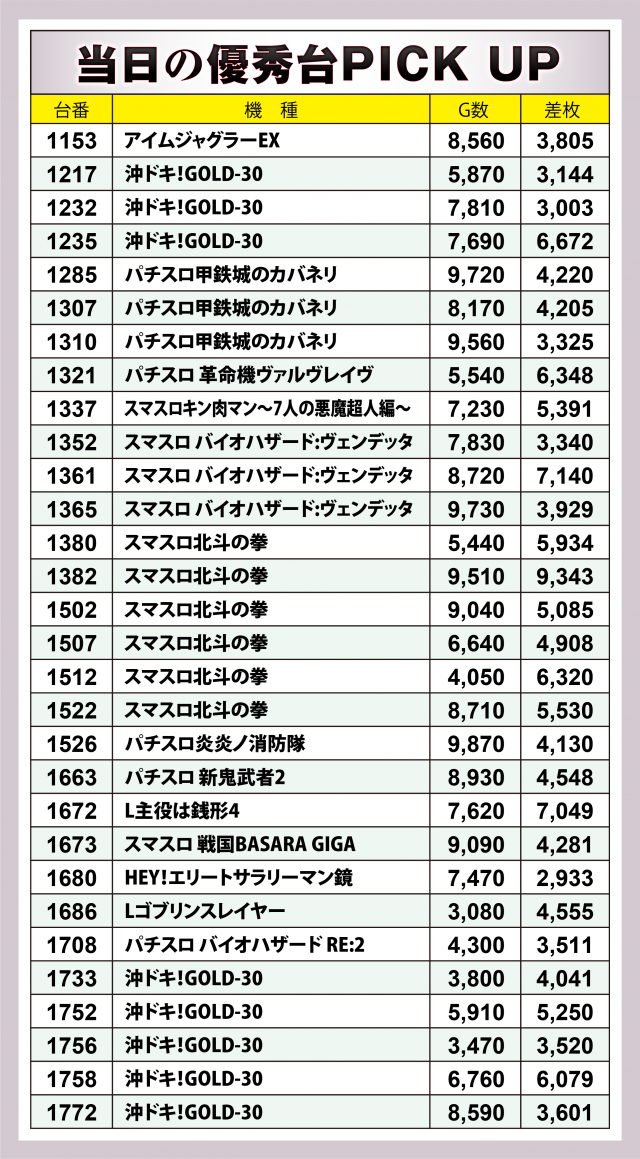 まずは優秀30台のPICK UPから。30台全てが差枚数+2千枚以上&+3千枚以上はほぼ全てとなる29台、+4千枚オーバーは全体の3分の2となる20台、+5千枚オーバーは全体の3分の1強となる12台、+6千枚オーバーが7台と、同店のハイレベルを示す結果となった。