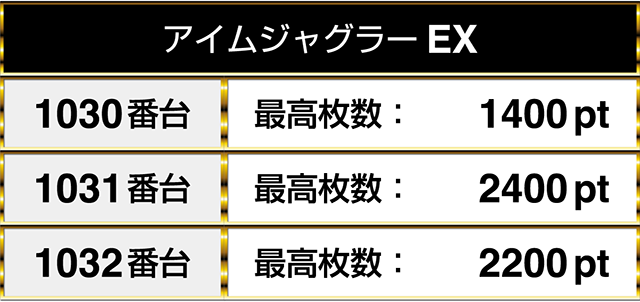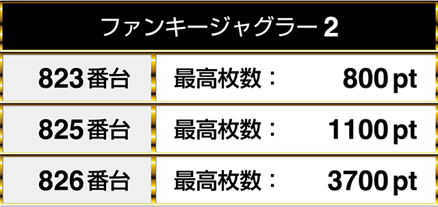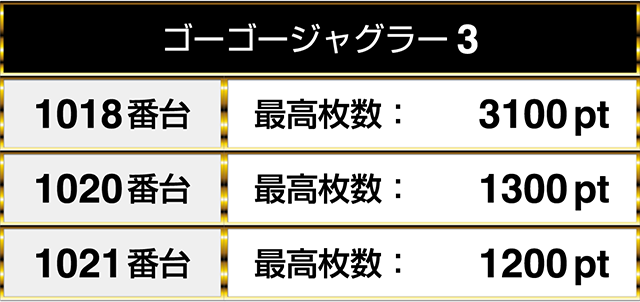 『ファンキージャグラー2』と『ゴーゴージャグラー3』も3台が連なってプラスptを記録し、どちらにも3000pt以上の台があった。