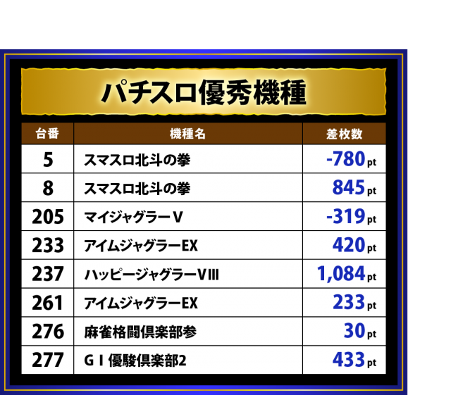 初回としては際立つプラス差枚数の台がなかったことは誠に残念。これからの調査で向上を期待したい。