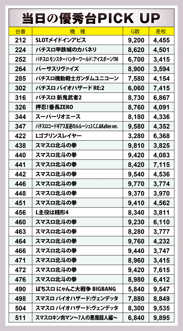 後述する好調2機種以外では、万枚到達目前の『スマスロキン肉マン~7人の悪魔超人編~』、+9千5百枚超に達した『ぱちスロ にゃんこ大戦争 BIGBANG』、+9千5百枚超&+8千8百枚超が1台ずつとなった『スマスロ バイオハザード:ヴェンデッタ』を始めとする、増台されたスマスロ陣が好記録を連発した。