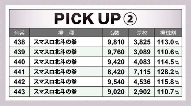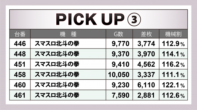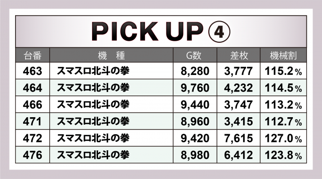 『スマスロ北斗の拳』18台では+7千枚超×2&+6千枚超×2&+4千枚超×4を輩出、そのトータルは+8万枚目前、1台あたりの平均は+4千4百枚オーバーのハイレベルとなった。