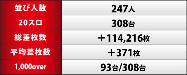以下、20スロ全308台の出玉データを詳細に分析し、当日の優良台の数値を迫っていこう。
