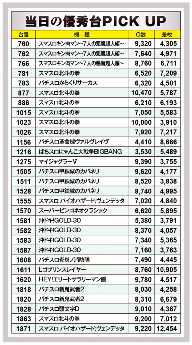 まずは優秀30台のPICK UPから。30台全てが差枚数+3千枚以上を達成、+4千枚以上は25台、+5千枚以上は14台、+6千枚以上は9台となった。後述する好調機種以外では、この日のトップ差枚数を叩き出した1871番台の『スマスロ バイオハザード:ヴェンデッタ』が+12,454枚をマークした。次いで1611番台の『Lゴブリンスレイヤー』が+10,905枚、さらに1156番台の『パチスロ革命機ヴァルヴレイヴ』が+8,666枚とスマスロ勢から大きな熱気が放たれていたのが特徴的である。その他にも各所で楽しめる環境が十二分に用意されており、手応えを感じ取れる内容となった。