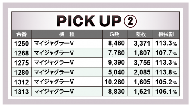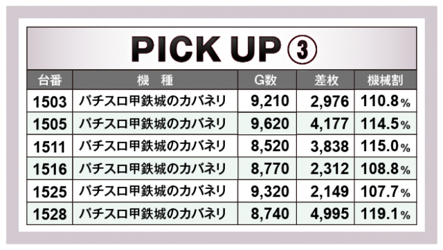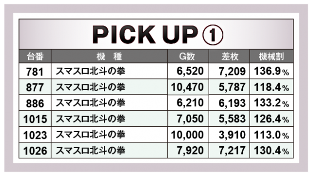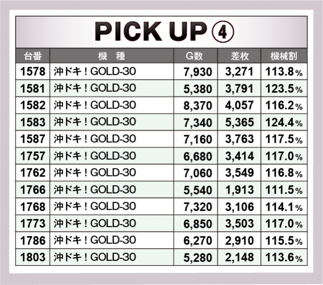 続いては当日好調だった4機種をチェック。まずはスマスロ機から大人気の『スマスロ北斗の拳』で、5台の+5千枚オーバーを中心に6台のトータル差枚数は+3万5千枚オーバーを記録!次いで、ノーマル機から『マイジャグラーⅤ』で、2台の+3千枚オーバーを筆頭に6台のトータル差枚数は+1万4千枚オーバーをマークした。そして6.5号機から『パチスロ甲鉄城のカバネリ』が、6台のトータル差枚数は+2万枚オーバー、さらに『沖ドキ!GOLD-30』で大量獲得台が多発し、12台のトータル差枚数は+4万枚オーバーと破壊力を見せつける結果となった。
