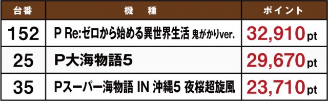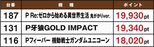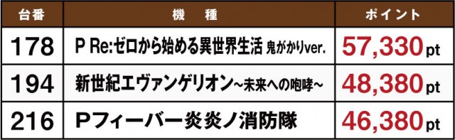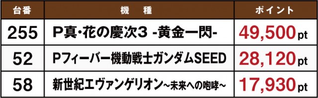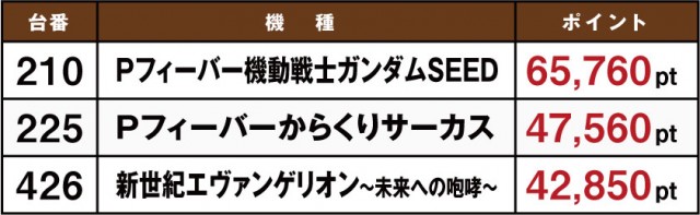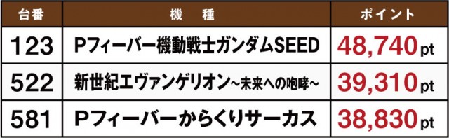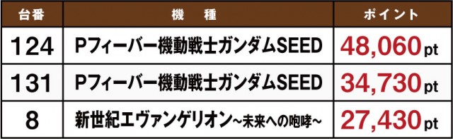 8月15日に実施された「ホームランボール」の模様をお伝えしていこう。やはり目立っているのはテレビCMでも話題となっている『Pフィーバー機動戦士ガンダムSEED』だ。これは『Pフィーバー 機動戦士ガンダムユニコーン』の実績があってこそだが、それだけでなく機種の性能的にも長けているのが見て取れる。菰野店や四日市店、四日市西店などでポイント数が高い店舗が存在しているからだ。ここからいまだ人気機種として君臨している『Re:ゼロ』や『エヴァ』に割って入れるか。これからの動向に注目したい。