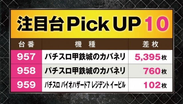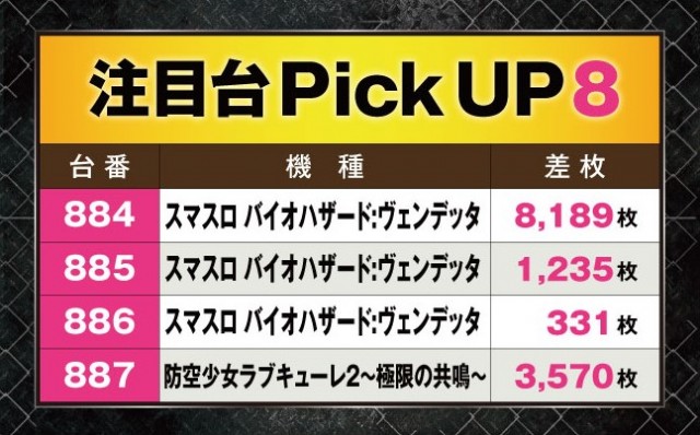 なかでも一際盛り上がりを見せていたのが『スマスロ バイオハザード:ヴェンデッタ』~『防空少女ラブキューレ2〜極限の共鳴〜』の4台並び。全台プラスのほか『スマスロ バイオハザード:ヴェンデッタ』が8,189枚と、スマスロの性能を最大限に発揮していたことが印象に残っている。